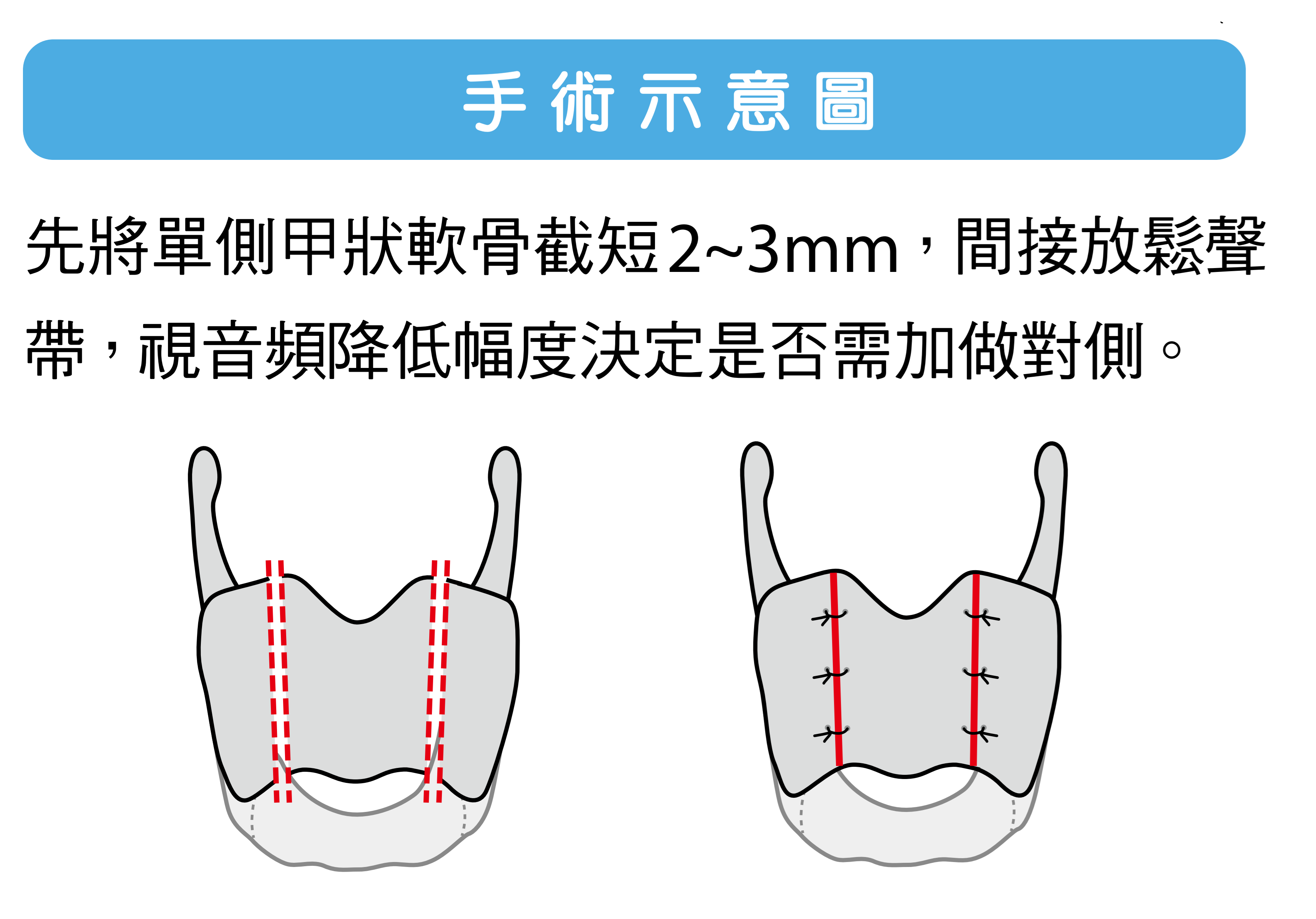 要特別提醒,手術的主要目標是”調整音高”,音質在手術後可能會有些許改變;另外,我們也建議接受過變聲或調音手術的患者,術後應接受一段時間的語言治療,學習不同性別的發聲特質,才能讓音色更接近理想中的狀況。